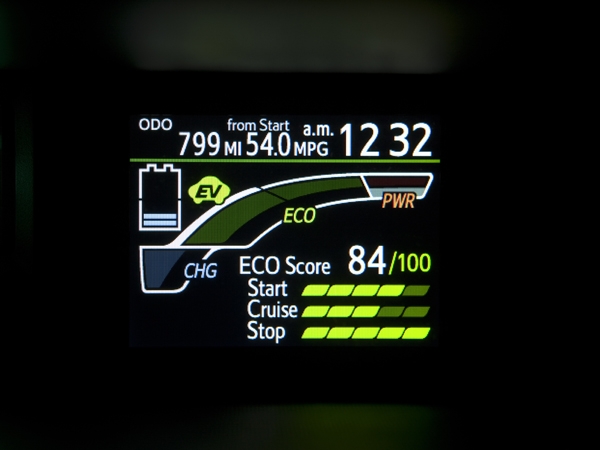 โดยที่หน้าจอ นั้นนอกเหนือจากบอกความเร็ว และ น้ำมันตามปรกติแล้ว ยังแสดงผล Energy Monitor ซึ่งน่าสนใจคือ มีตัวเลขแสดงค่า ECO Scoreเป็นตัวเลขบอกว่า คุณกำลังขับรถประหยัดน้ำมันมั้ย ซึ่งจะแสดงผลแบบ Real Time คือถ้าคุณเหยียบคันเร่ง ค่าจะลดเป็นต้น คุณจะรู้ตัวได้ทันที ซึ่งเทคนิคนี้เป็นกลยุทธ์เกมมิฟิเคชันที่ได้ผล เพราะจะจูงใจให้คนขับรู้สึกอยากจะรักษาระดับคะแนนให้สูงๆอยู่เสมอ