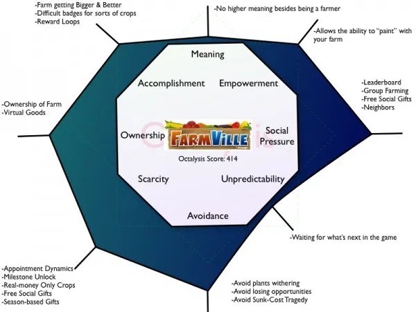 ประโยชน์อีกอย่างที่สำคัญมากของรูป Octalysis Framework คือ มันจะช่วยให้เราเข้าใจภาพกว้างของเราได้ดีขึ้นครับ บางครั้งเวลาออกแบบ เราก็อาจลืมดูว่าตอนนี้ระบบของเราเป็นยังไง อย่างเช่นเกม Farmvile เป็นต้นครับ ที่พอได้ทำ ภาพ Octalysis แล้วพบว่า เกมเน้นไปทาง Left Brain Black Hat มาก ซึ่งคือการเน้นที่ การได้รับรางวัล และ ความรู้สึก หมกมุ่น วิตกกังวล ซึ่งพอเป็นแบบนี้ก็ทำให้ในระยะยาวแล้ว ผู้เล่นจะรู้สึกเหนื่อย และ ล้าในการเล่น เป็นต้น ก็เห็นว่าทำให้ในเกมถัด ๆ มา ทางค่ายเกมก็ปรับให้เกมมีความ Black hat น้อยลง
