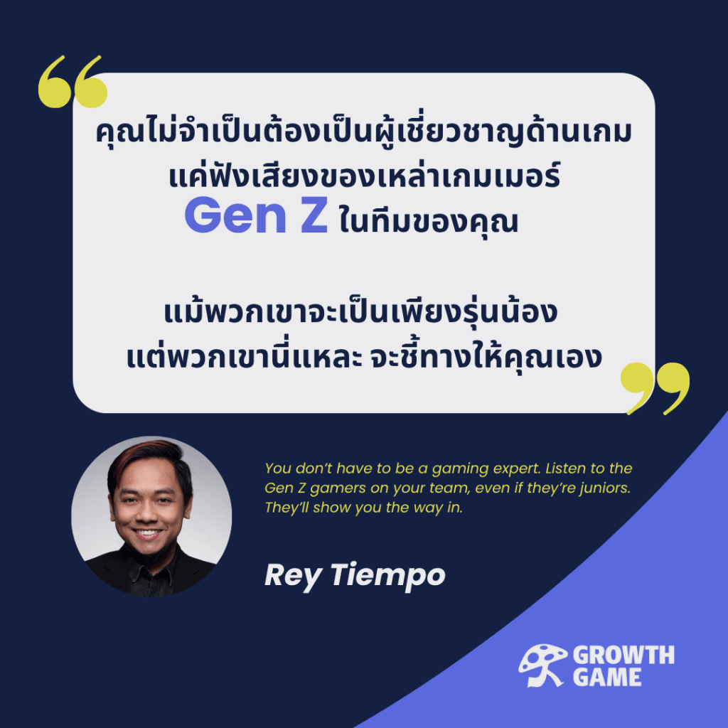 “คุณไม่จำเป็นต้องเป็นผู้เชี่ยวชาญด้านเกม แค่ฟังเสียงของเหล่าเกมเมอร์ Gen Z ในทีมของคุณ แม้พวกเขาจะเป็นเพียงรุ่นน้อง แต่พวกเขานี่แหละ จะชี้ทางให้คุณเอง”